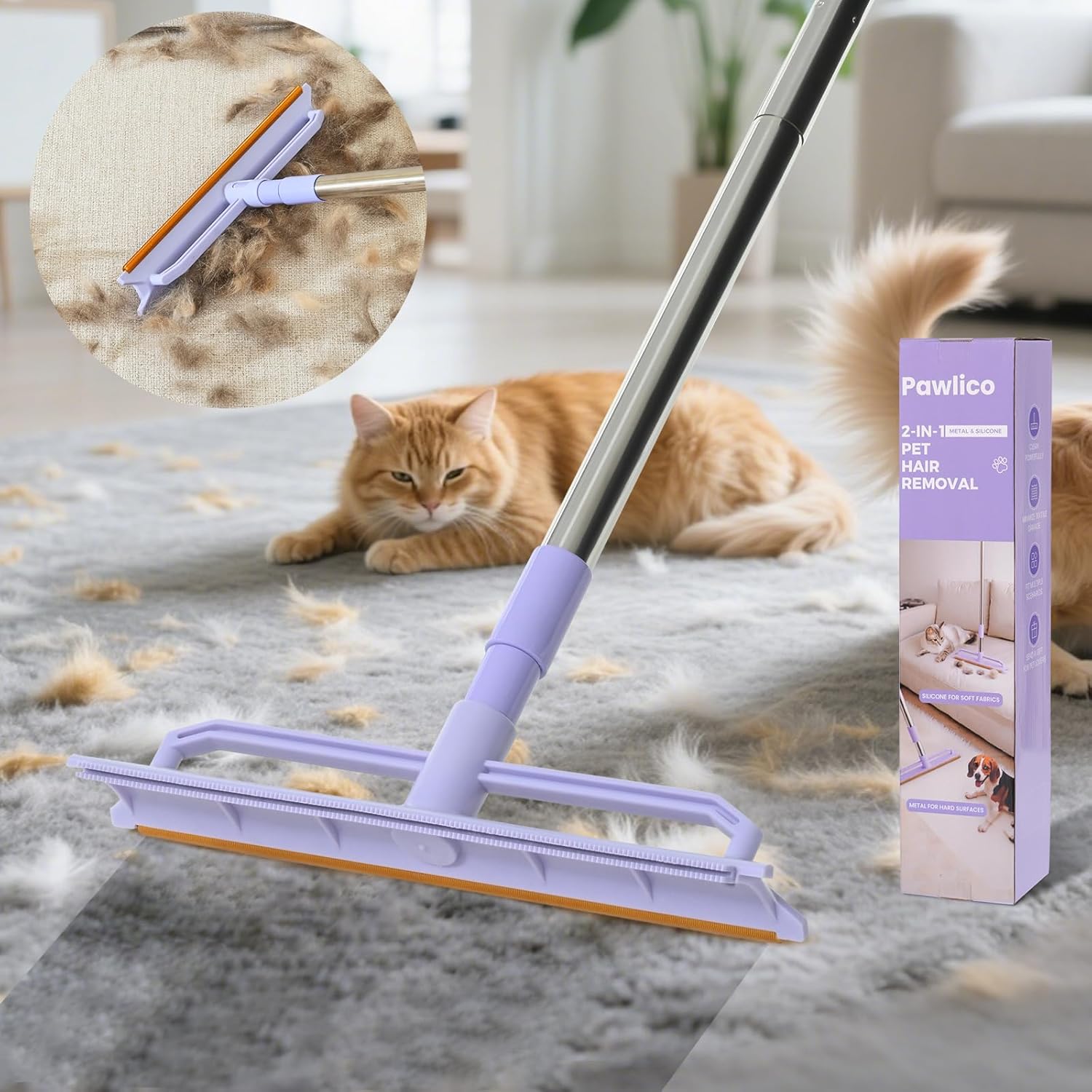 【2-IN-1 DOUBLE-SIDED CARPET RAKE】: Pawlico’s innovative carpet rake features a dual-sided design and a long handle for versatile cleaning. The metal side, with its patented gear-shaped design, can deeply clean rough carpets and long-pile carpets, while the silicone side, with its serrated design, can gently clean without damaging the surface.