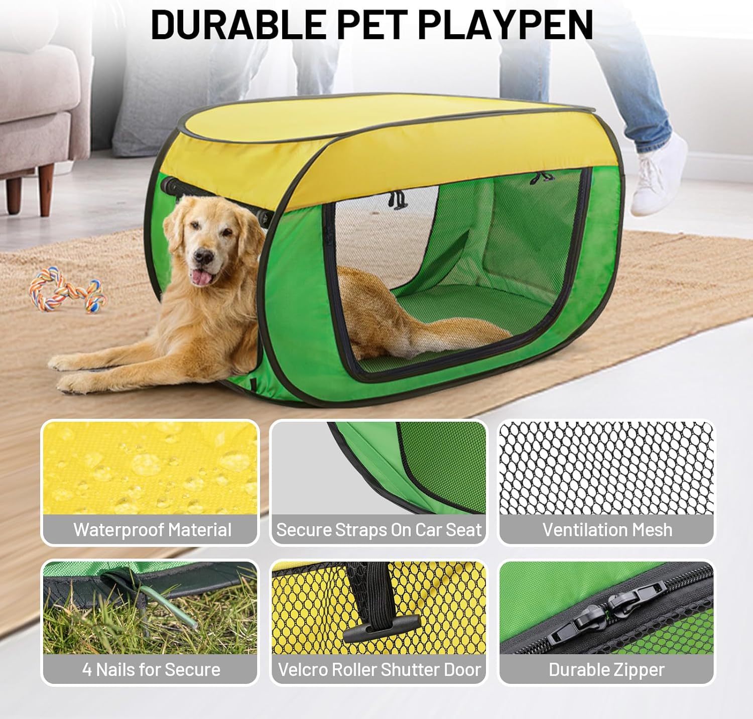 Safe & Convenient Travel: This foldable dog crate includes seatbelt straps for secure placement in cars, trucks, SUVs, or RVs. It also features 4 tent stakes for stable use on grass, making it ideal for both car trips and outdoor adventures.