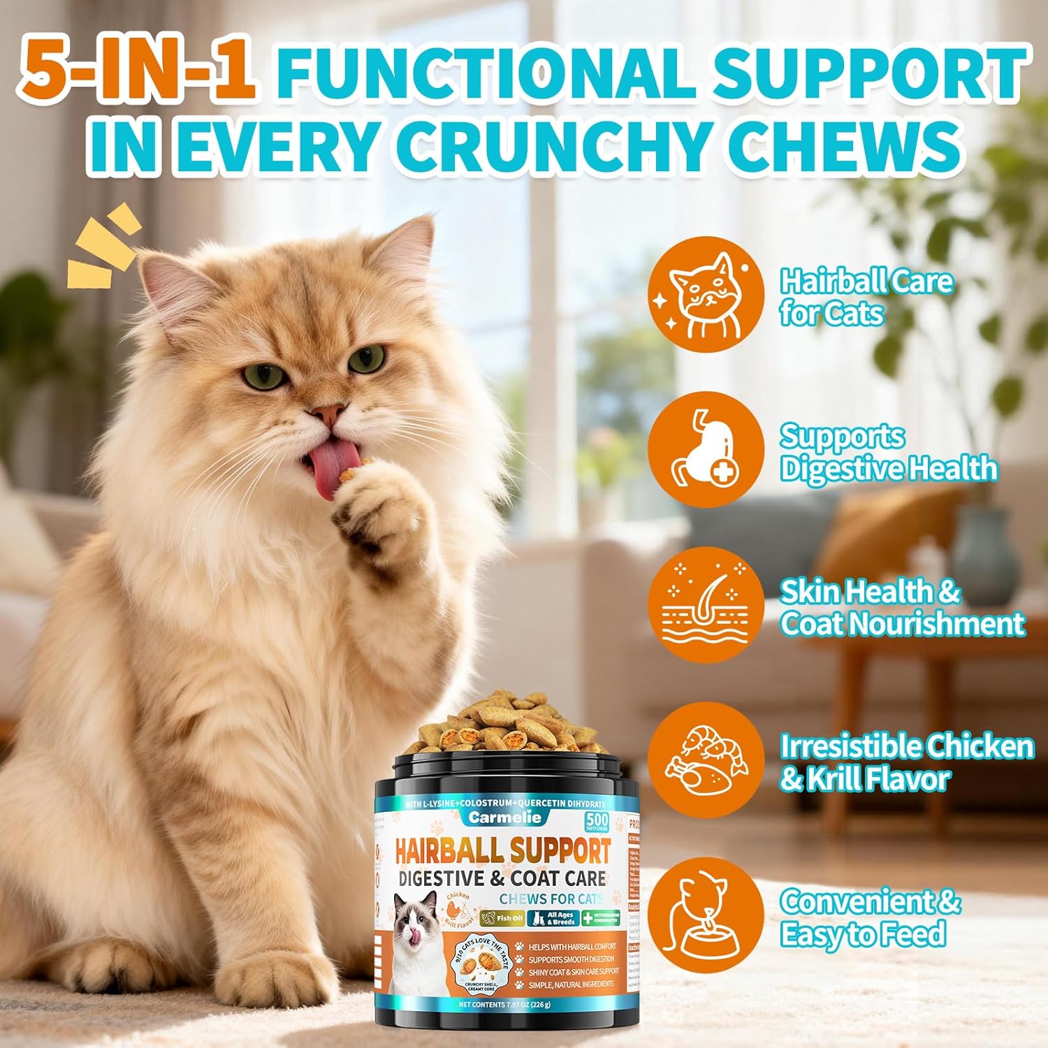 5 reviews for Cat Hairball Support Chews – 500 Crunchy & Creamy Texture Hairball Treats for Cats – Texture Indoor Feline Digestion Formula, Hairball Control & Cat Digestion Support, Chicken & Krill Flavor