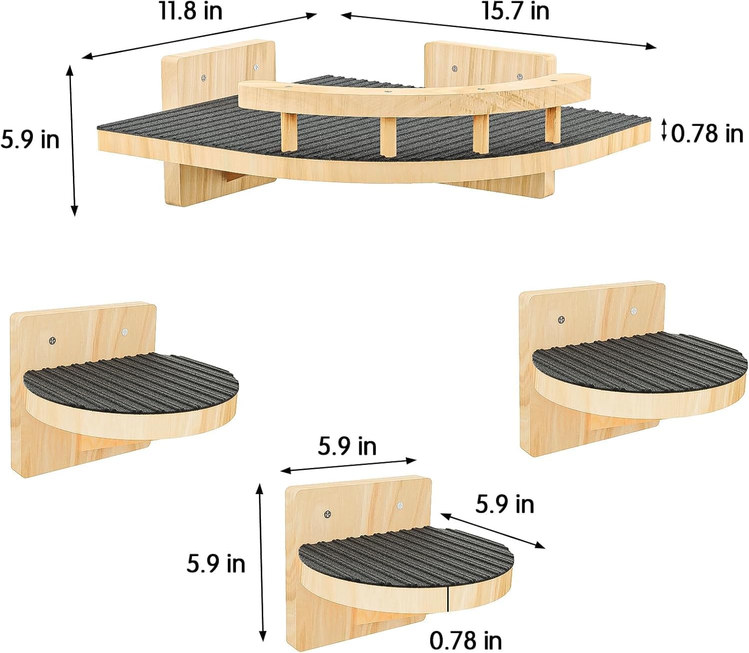 Suitable for Small/Medium Cats: The largest-sized shelves measure 15.7 × 11.8 inches, and the three small-sized ones measure 5.9 × 5.9 inches. All of them are made of wood planks with a thickness of 0.78 inches. Providing multiple paths for your small or medium cat to explore, jump, and stay active—turning any wall into an energy-burning playground.