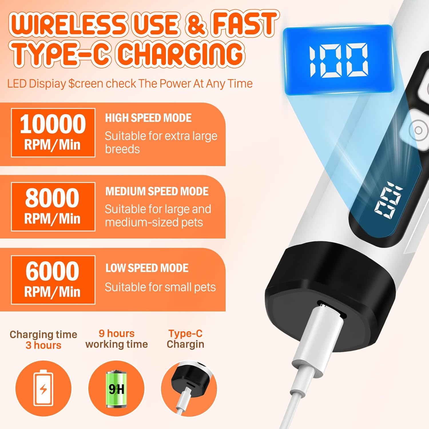 √ 【Safe and Effective dog nail trimmer】The pet nail clippers features an advanced diamond drum bit that ensures safe and precise dog nail trimming, Also suitable for large dog nail clippers,making it a must-have among dog nail clippers and nail grinder for dogs. Enjoy stress-free grooming sessions backed by veterinary recommendations for your pets.