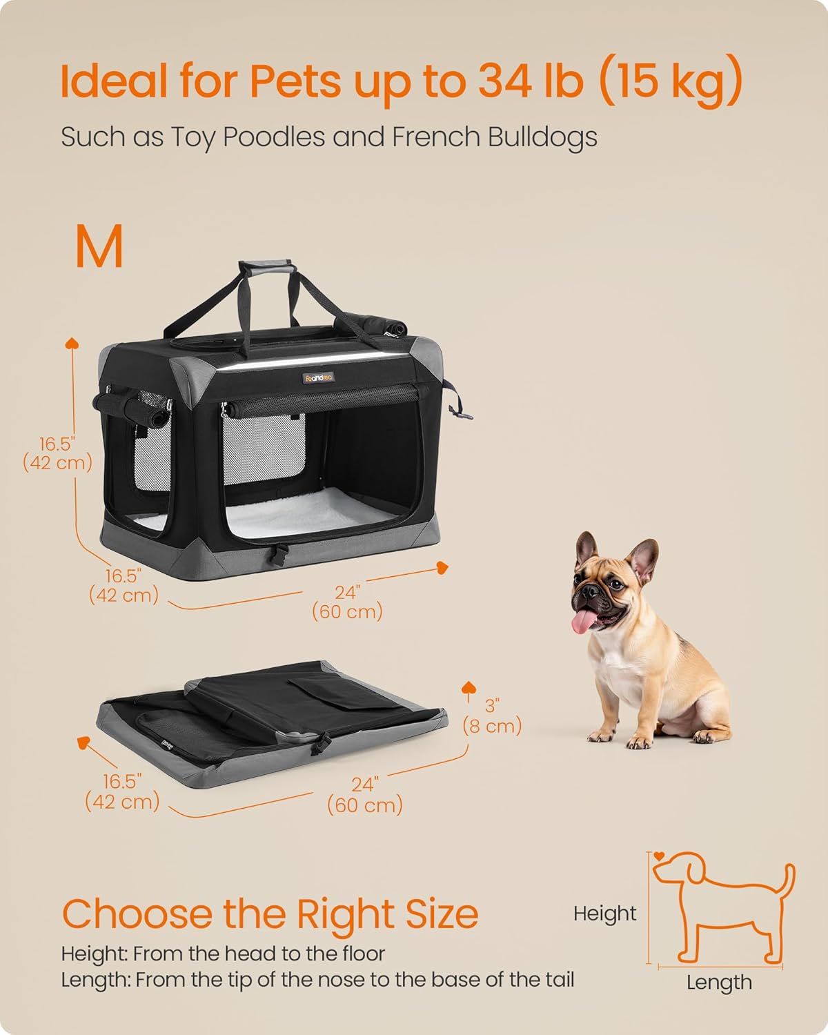Built Tough, Travels Safe: Made of a robust steel frame and scratch- and tear-resistant Oxford fabric, the soft dog crate is designed for durability. Safety zippers ensure pets can’t open it from the inside, and reflective strips add extra safety