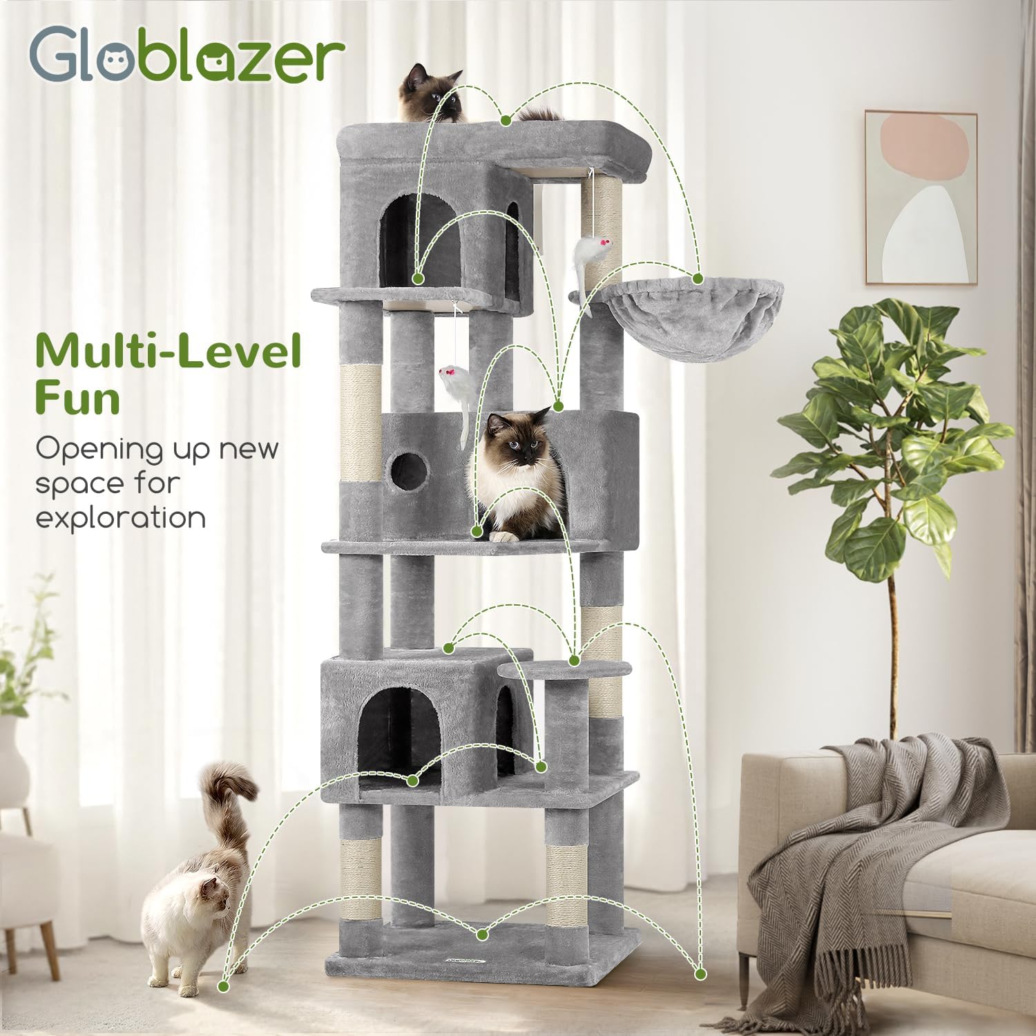 8 reviews for Globlazer Corner Cat Tree 66 inch Multi-Level Climbing Tower Kitty Condos Cat Scratching Tower for Indoor Multiple Cats with Large Platform, 3 Cat Caves, F66, Light Grey