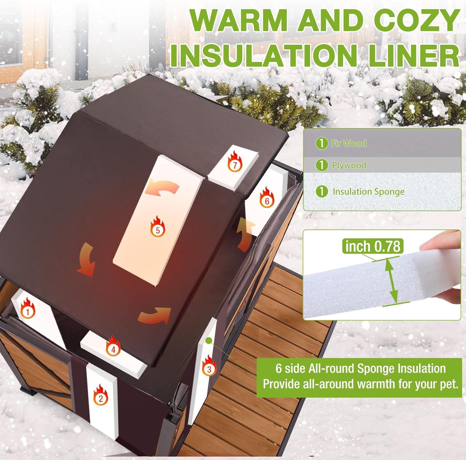 Advanced 8-Layer Heated Insulation System: Keeps pets warm in extreme cold with 6-sided sponge insulation and an 8-layer thermal structure—including waterproof Oxford cloth/PVC, needle-felt cotton, and built-in heating wires (95°F–113°F). The 0.78″ flame-retardant sponge delivers safe, all-around warmth with fewer, more efficient heating elements.