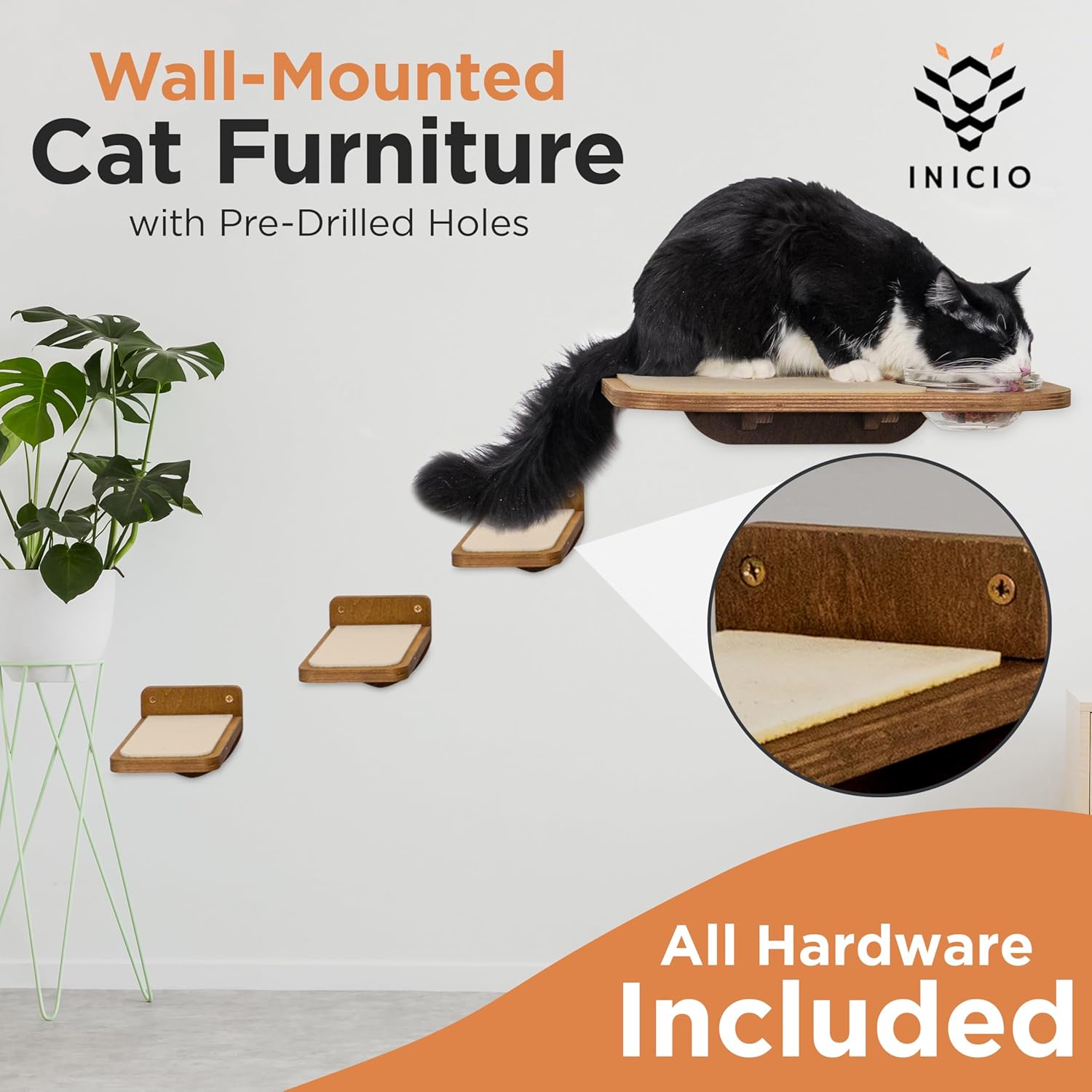11 reviews for INICIO Cat Shelves – Dog Proof Feeding Station with Wall Mounted Shelves, Durable 3 Step Birch Floating Shelf for Cats Up to 15lbs, Includes Attached Cat Food Bowl for Convenient Feeding – Brown