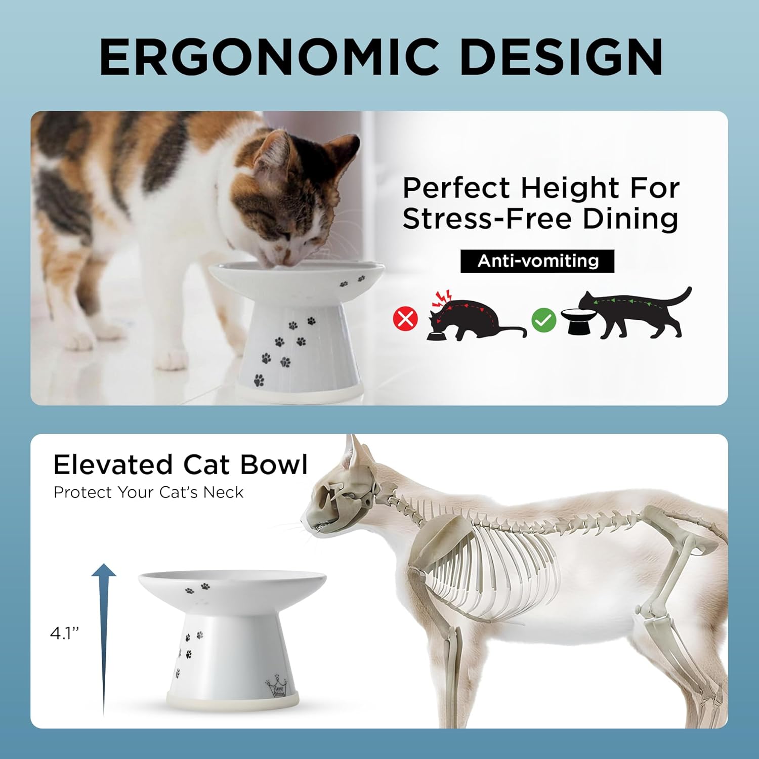 I’m absolutely thrilled with these cat bowls. The quality is outstanding, made from high quality porcelain that feels durable, smooth, and solid. Also has an anti slip grip ring at the bottom. The design is simple but elegant, with that cute cat face detail at the bottom. The size is perfect, deep enough to hold food or water comfortably, yet shallow enough to prevent whisker fatigue.They are elevated at just the right height which makes eating much easier for my cats and helps with digestion. I love that they have an anti spill lip, it actually works. No more food sliding over the edge.They arrived incredibly fast, perfectly packaged, and exactly as described. The price is amazing for this level of quality. Dishwasher and microwave safe is a huge bonus, and I love that they are lead and cadmium free.If you are looking for beautiful, safe, and functional bowls that both you and your cats will love, get these. You will not regret it.
