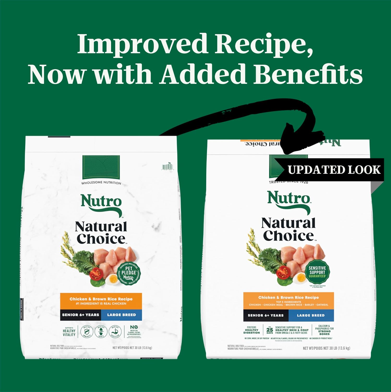 Nutro believes in the power of wholesome ingredients to support the health and happiness of senior dogs. Nutro Natural Choice Large Breed Senior Dog Food Chicken & Brown Rice Recipe is a carefully batched and oven-dried dog food thoughtfully crafted to meet the specific needs of older dogs by supporting strong bones with calcium and phosphorus. This recipe’s formulation includes an updated top 5 ingredients. It’s made with chicken as the first ingredient, chicken meal, brown rice, barley, and oatmeal and is crafted with no corn, wheat, or soy protein. To support sensitive skin and stomach, this dry dog food recipe is designed with beet pulp, a natural prebiotic fiber, to foster healthy digestion and is crafted with an optimal ratio of omega-3 and omega-6 fatty acids to nourish sensitive skin for a soft shiny coat. Nutro Natural Choice Large Breed Senior Dog Food Chicken & Brown Rice Recipe is crafted with no artificial flavors, colors, or fillers, although trace amounts may be present due to potential cross-contact during manufacturing. Choose Nutro Natural Choice Large Breed Senior Dog Food Chicken & Brown Rice Recipe for a quality dry dog food that supports your large breed senior dog’s vitality and well-being.