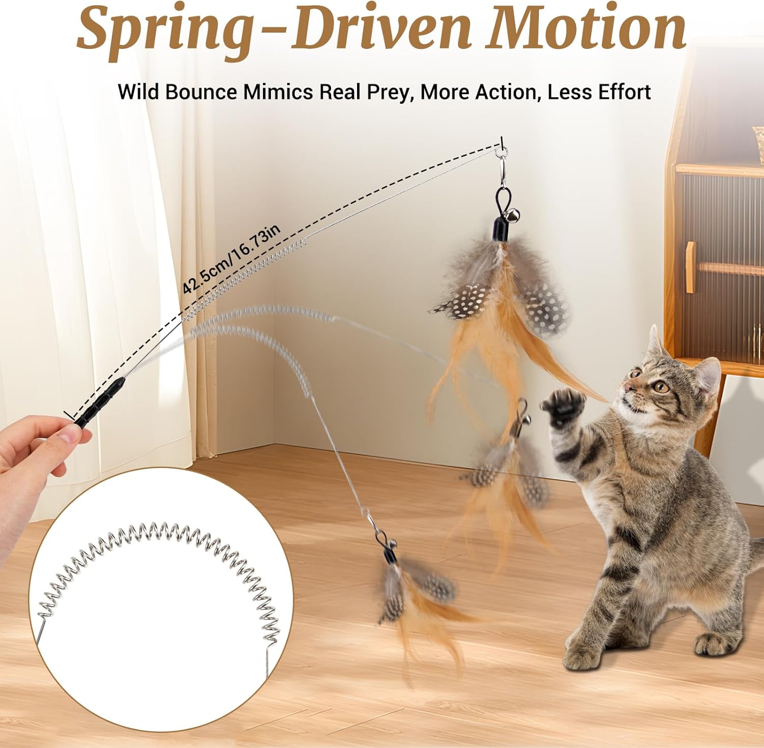 WILD MOTION THAT TRIGGERS REAL HUNTING INSTINCTS The built‑in spring creates unpredictable bouncing action that mimics live prey. More jumps. More pounces. More exercise — with less effort from you.