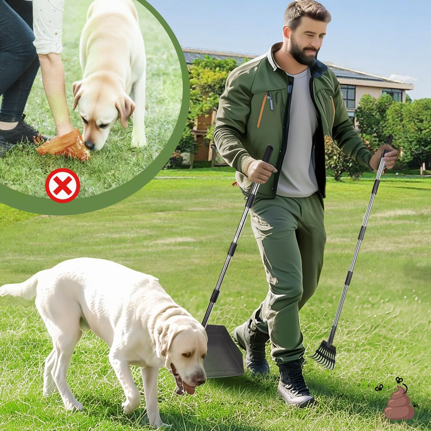 I use this to poop scoop my yard for my pigs. Super easy to use the rake and pan. I can clean up my 2 acres (where my pet pigs free range & graze) easy breezy! Great size pan, great length of the poles.