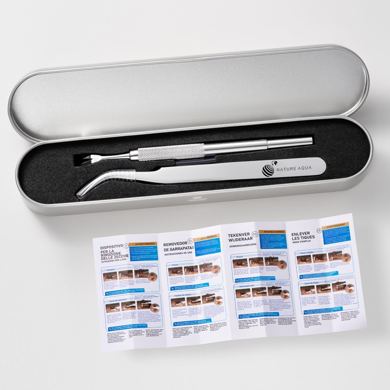 1x NatureAqua tick tweezers 1x NatureAqua tick fork 1x NatureAqua manual 1x Durable foam insert 1x Metal handy storage tin