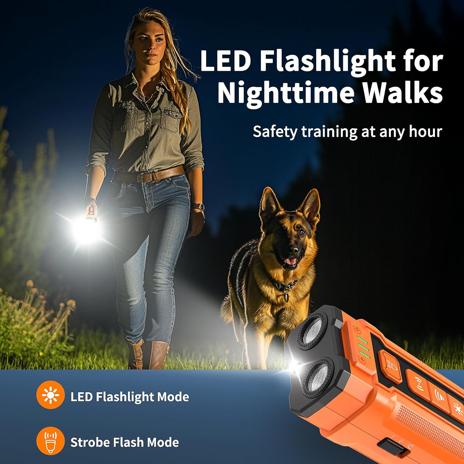Activate the led flashlight bark control for visibility in low-light conditions, or switch to flashing light dog deterrent mode to deter reactive dog bark control issues safely. Humane ultrasonic bark control device for safe outdoor walks. Stop barking, aggression and encourage positive dog behavior.