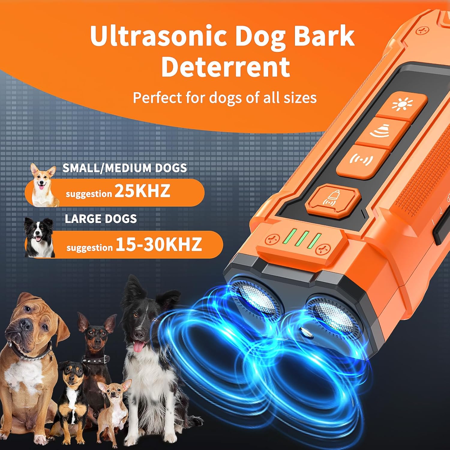 Exactly what we needed for Dexter the Mountain Feist!!As you can see in the video, Dexter is the definition of a Feist and has a bark for everything. He has 5 different high pitch barks for each person in the house to alert the rest of us that they are home. Then he has his Feist “marking prey” bark, that he only seems to use on me ALL OF THE TIME. Not out of aggression, but like a Town Caller, notifying the house of my movements 🤣😂. It was funny at first, then it got super annoying and so we purchased 2 different sonic devices. The hand held one is pictured next to this unit and a “Bark deterrent house.”In the video is Lexi. Lexi was true to her breed as full bred AmStaff and only used her voice for immediate threats, alerting growls & gruffs and of course the Sounds of her People, the Velvet Hippos, with her “pittie talk.” But always silently watched the neighborhood.Then came DEXTER! Who now identifies as a 90lb Yapping & Barking AmStaff and Lexi now barks atat people walking by or deliveries. The exact opposite of what my Service Animal should be doing.We purchased the smaller controller and a distance of 50’+, it worked great, often punished the other dog nearby and they got used to the sound wave. So it began to work less and less.The “sonic house” was TOO reactive/sensitive. It would emit from the electric deadbolt key pad and again effect both dogs.This slightly larger ultrasonic device is PERFECT! As you can see in the video, due to its shorter sound wave range and multiple frequencies, Dexter barked, I pressed the button and instant quiet.Since then, we have only had to use it once for Dexter and if either are barking, when they see us reaching for it or we say “getting the controller.” Instant compliance.What an absolute unit! So happy I got to order and review this product.PS if you point it across a sheet of tinfoil, you’ll hear the sound. Lesson learned and sound confirmed 😉