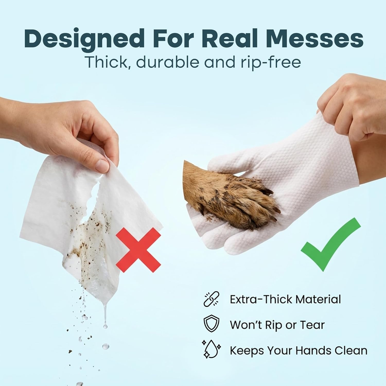 Mess-Free & Extra-Thick: Pet cleanup can be messy, so we made our dog & cat cleaning wipes extra-thick! Every glove provides a rip-free, mess-free, comfortable experience for you and your pets!