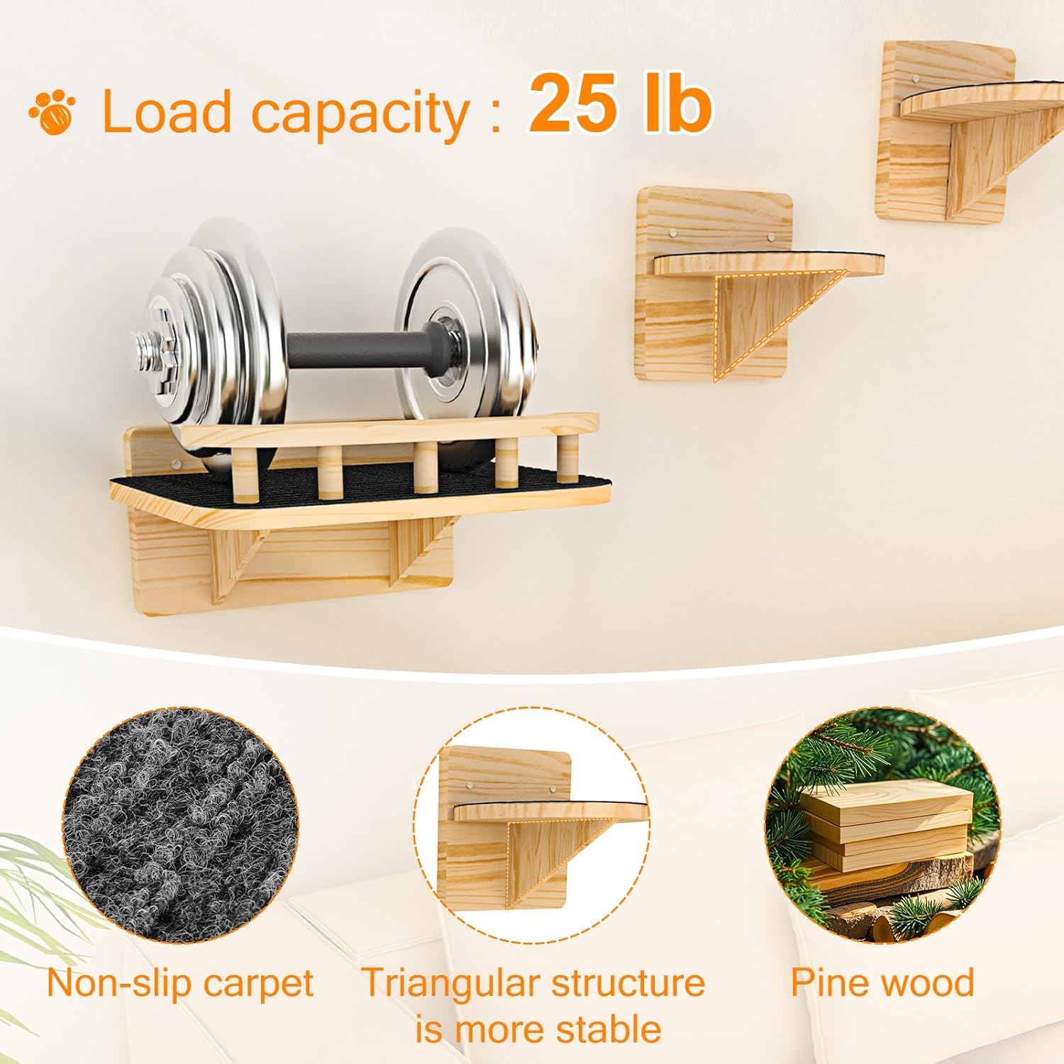 Natural Solid Wood Construction: The cat wall climber is made of sustainable pine wood, combining excellent load-bearing capacity (up to 25lbs) with eco-friendly features, seamlessly blending with your home decor for a stylish and worry-free pet-friendly environment.